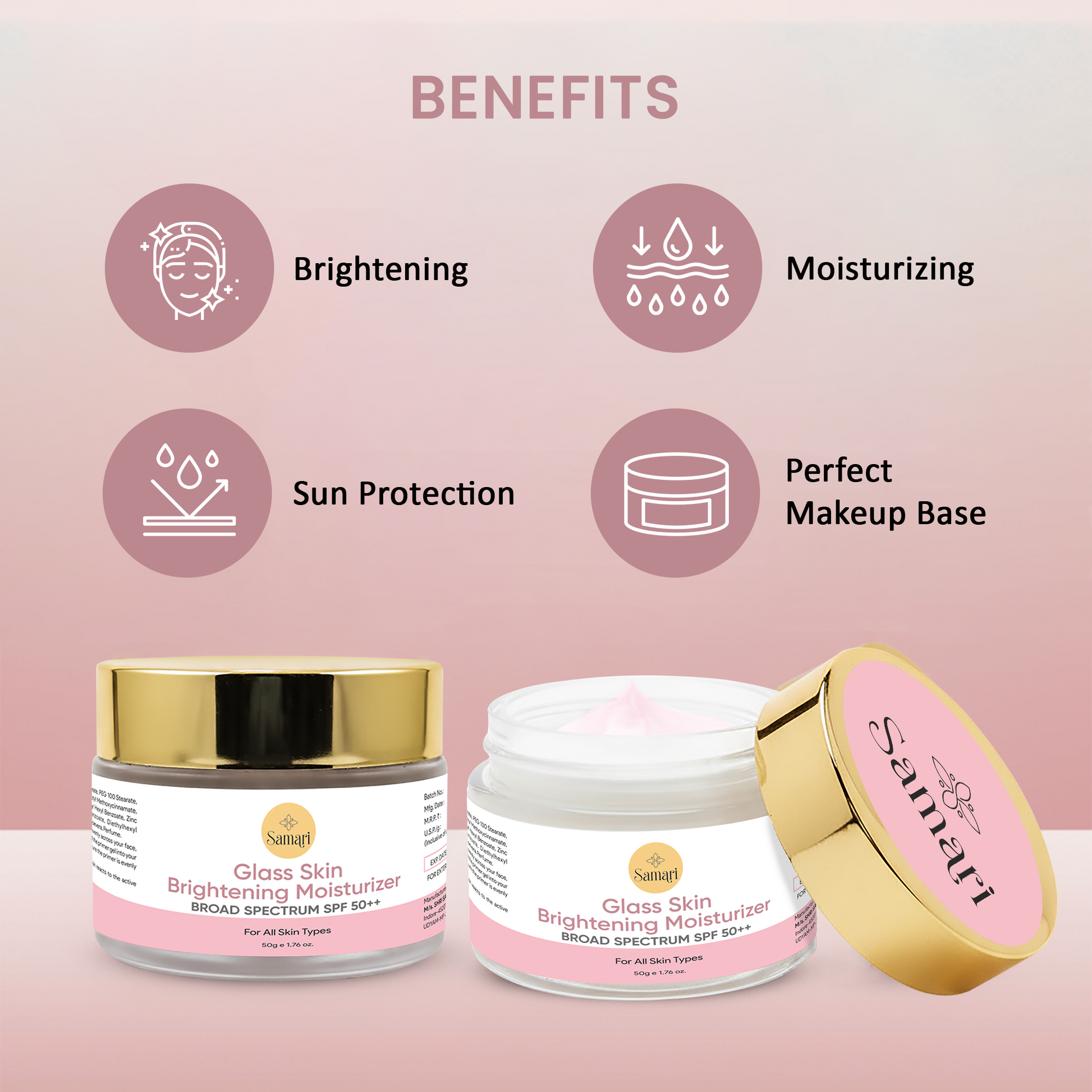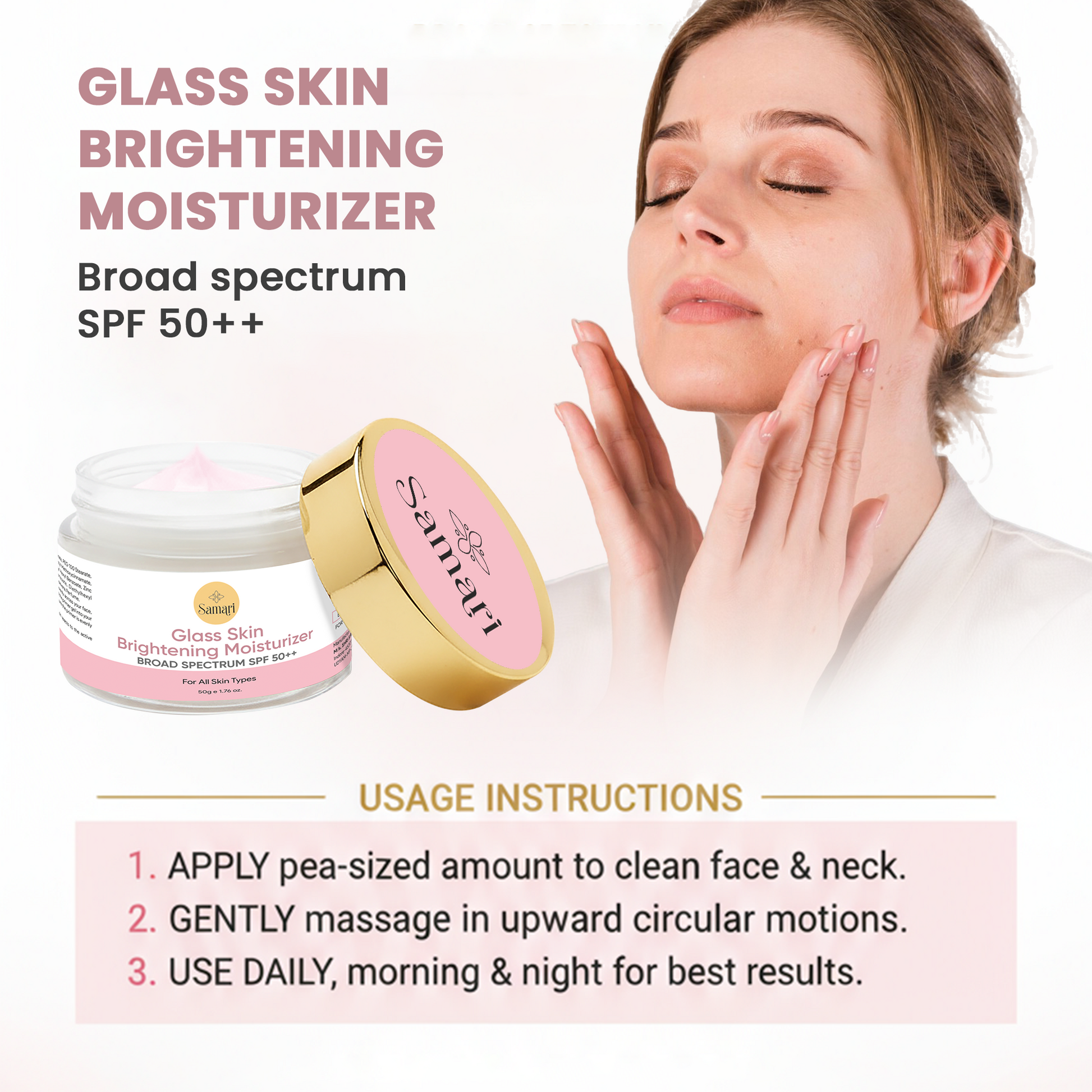 Samari Glass Skin Brightening Moisturiser SPF 50++ gives you that fresh, luminous look from the very first use. Its soft, buttery texture glides on smoothly, keeping your skin hydrated, bright, and naturally radiant all day.